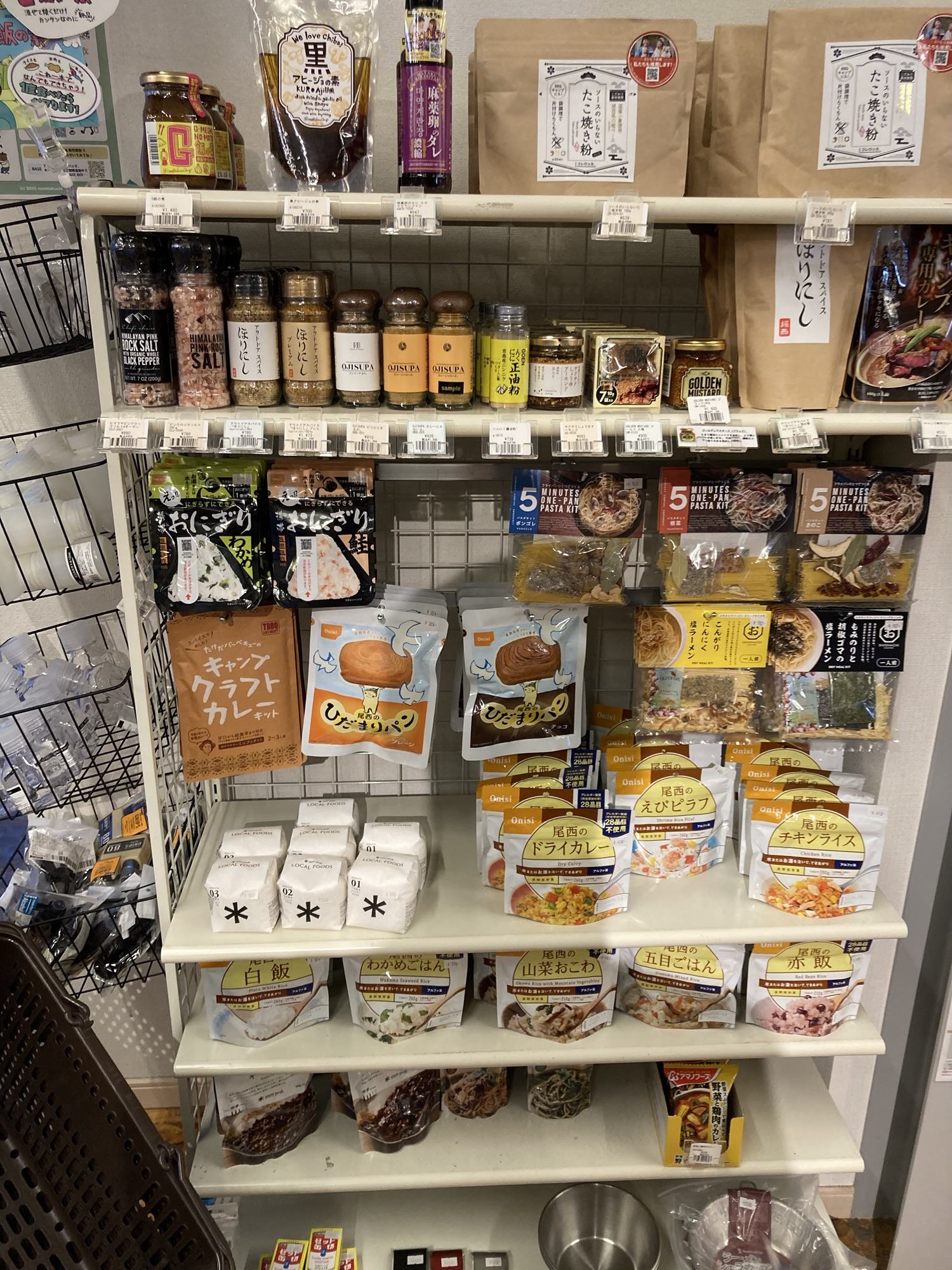 小物類やキャンプ飯用の調味料、レトルト食品も揃っていて、