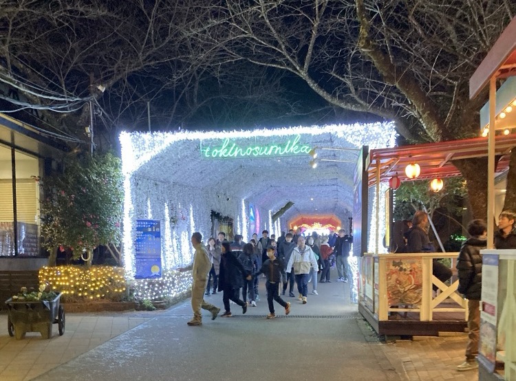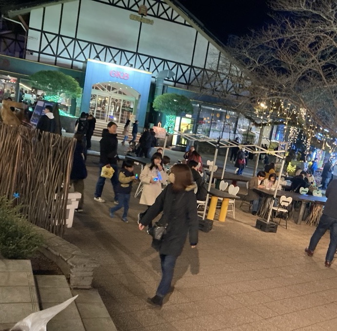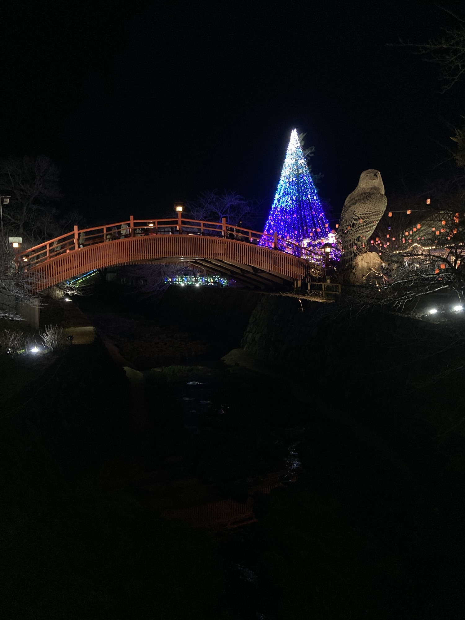 夜はイルミネーションの光に包まれて、雰囲気が一気に変わる。