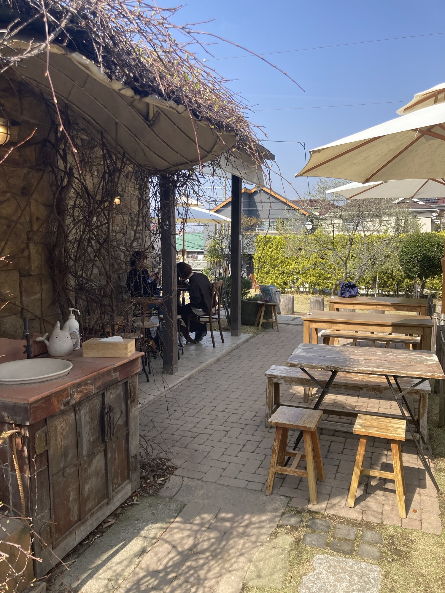 店外にはテーブルとベンチがあり、なんと コーヒー無料。